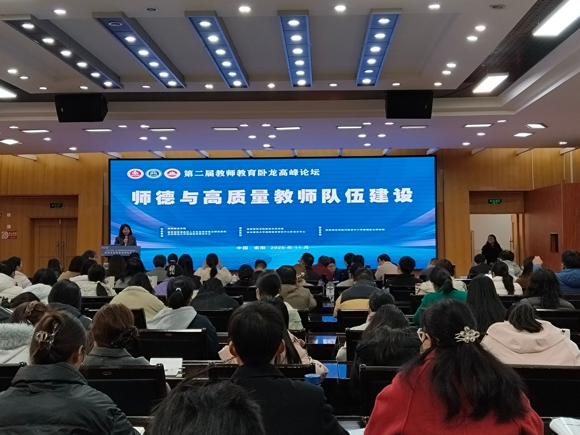 本网讯(通讯员 陈晓康/文 马福全/图)2025年11月30日,以“师德与高质量教师队伍建设”为主题的第二届教师教育卧龙高峰论坛在南阳师范学院召开。本次论坛由南阳师范学院与北京师范大学教师教育研究中心联合主办,由教育科学学院及北师大教师教育研究中心卧龙分中心共同承办。