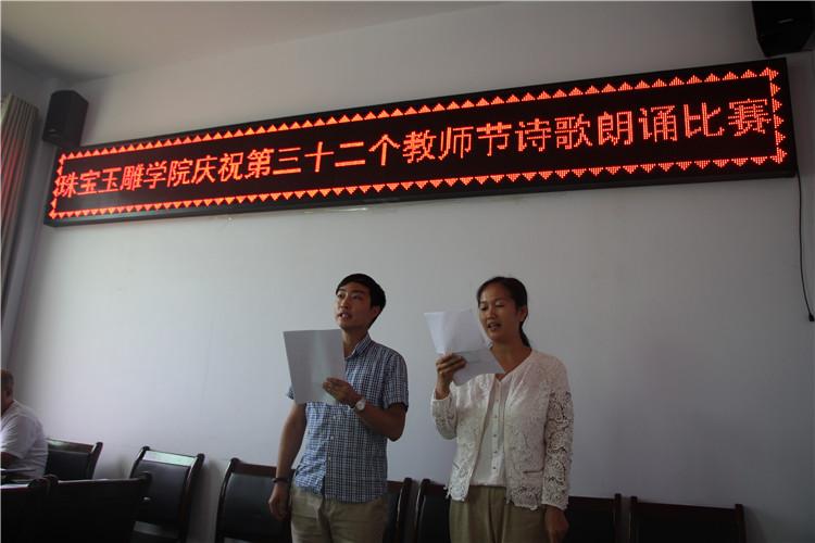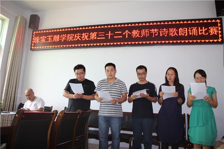 珠宝玉雕学院党总支书记、分会主席李春杰带领大家学习了中国古代的师德规范、《高等学校教师职业道德规范》及高校教师师德禁行行为“红七条”,并介绍了教师节的来历。该院教职工以教研室为单位举行诗歌朗诵会。珠宝玉雕教研室集体朗诵了《教师颂》,基础教研室集体朗诵了歌颂教师的现代诗,服装设计与工程教研室王永华、徐智泉老师朗诵了李商隐的《无题》,雕塑教研室霍鹏飞老师为大家朗诵了《诗经》中赞颂老师的名句。这些诗歌或是赞颂教师无私奉献的精神,或是体现教师的职业自豪感、或是表达对老师的敬意。此次活动不仅庆祝了我们的节日——教师节,而且充分展示了珠宝玉雕学院教职工的风采。