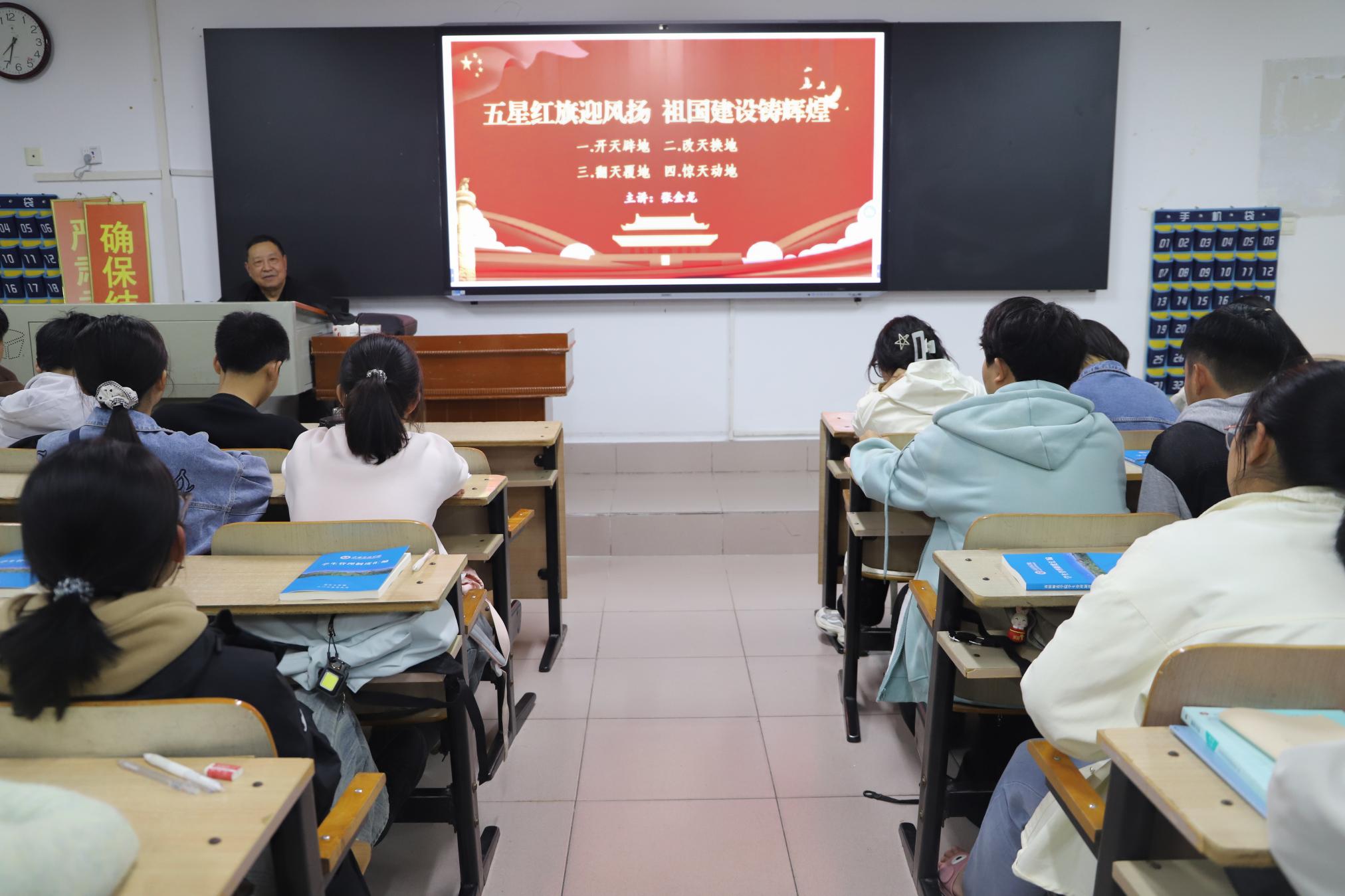 本网讯(通讯员 唐李静 黄煜婷/文 李梦珂/图)为引导2025级新生坚定理想信念,厚植家国情怀,10月13日晚,我院于逸夫楼S506教室开展“五星红旗迎风扬,祖国建设铸辉煌”教育讲座,本次活动由我校退休教师张金龙主讲,2025级新生参加。 讲座伊始,张金龙首首先从 “开天辟地”“...