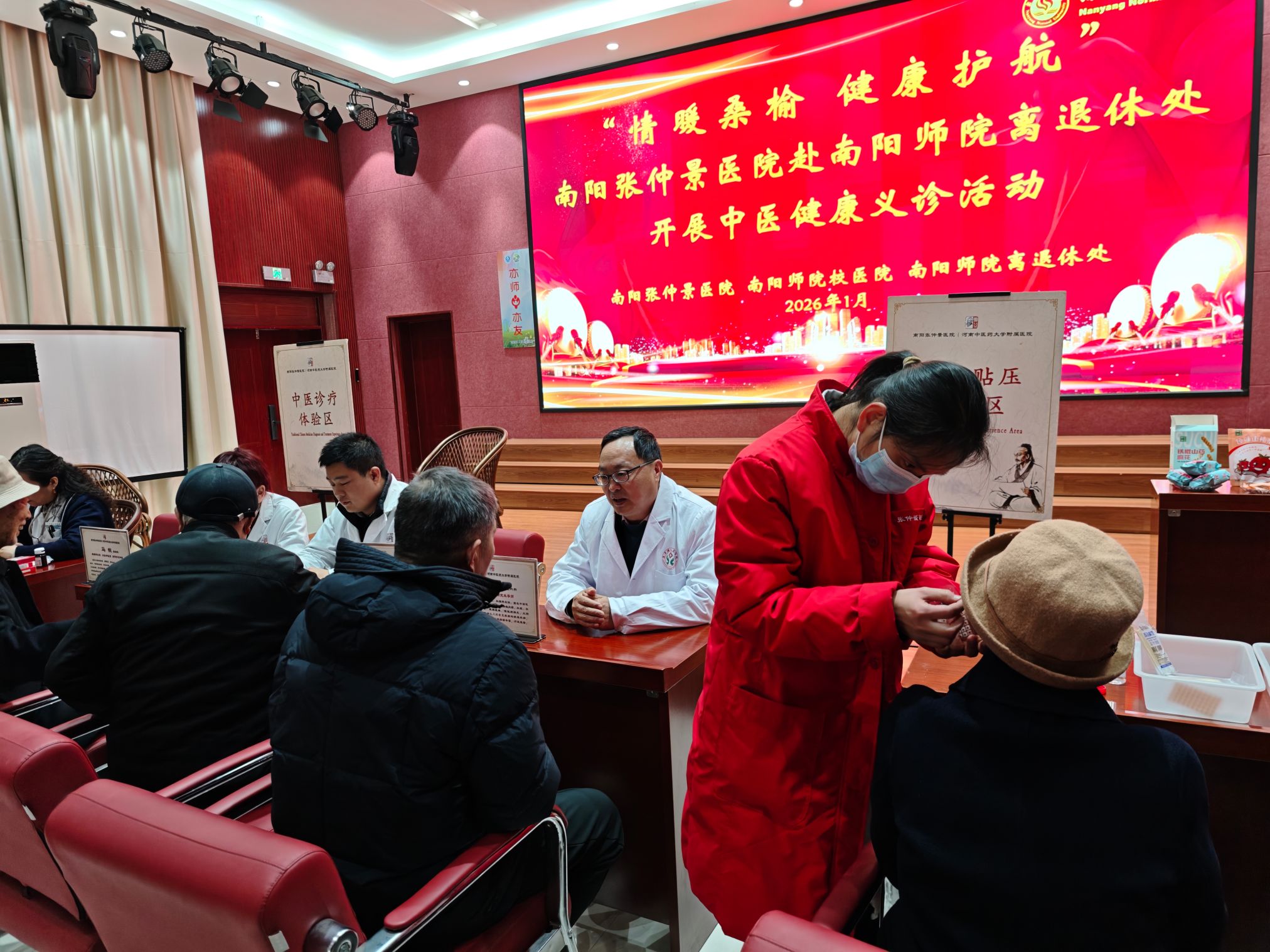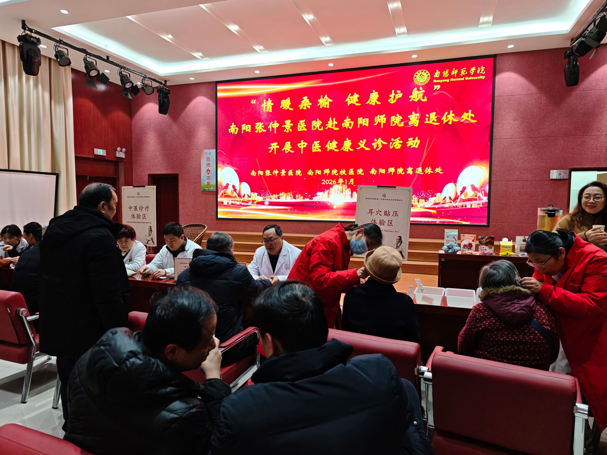 本网讯(通讯员 马春苹)为关爱广大退休老同志的身体健康,1月14日下午,离退休职工工作处联合校医院,特邀南阳张仲景医院肛肠科吴春生副院长、中医内科马锐主任等专家团队一行12人,在教职工活动中心多功能厅开展“情暖桑榆 健康护航”中医健康义诊活动。近百位老同志前来就诊咨询。