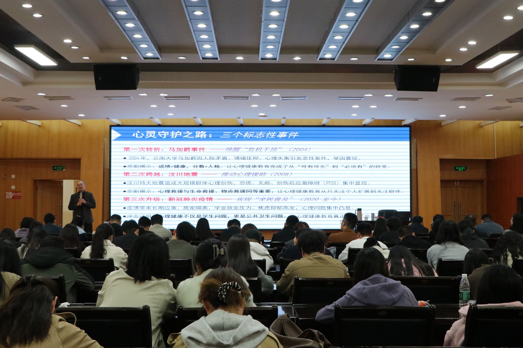 报告会上,丁新胜教授紧密结合当前高校心理健康工作新形势、新特点,深入剖析了当代大学生心理问题的现状、类型及深层成因,系统阐释了大学生心理问题的典型表现、多维度科学识别方法,详细讲解了全周期、全方位心理预防体系的构建路径,并结合高校工作中的真实案例,进行了深入浅出的实操分析和经验分享。整场报告内容翔实、逻辑严密、重点突出,既有理论高度,又具实践指导性,为一线学工队伍开展大学生心理健康工作提供了简洁高效、专业实用的方法指引,有效提升了学工队伍识别和应对大学生心理问题的能力。