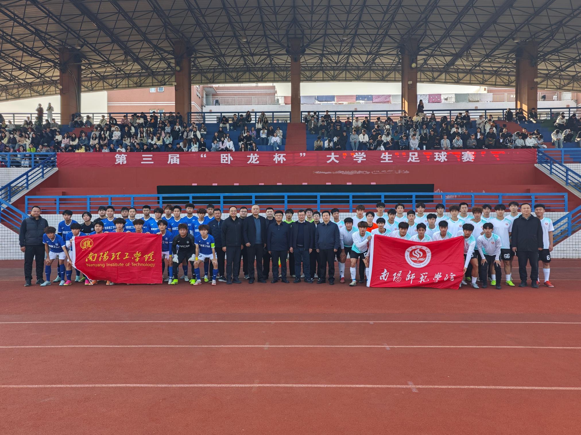 本网讯(通讯员 杨眉 马海菡/文 尚梦媛 马海菡/图)为丰富校园体育文化活动,增强同学们的综合素质,加强南阳高校校际交流,传承体育精神,10月30日下午,第三届“卧龙杯”大学生足球赛在我校中区田径场举行。校党委副书记刘红林、南阳理工学院副校长黄金书出席,学生处、体育学院负责同志,南阳理工学院相关负责同志,校团委同志观看此次比赛。