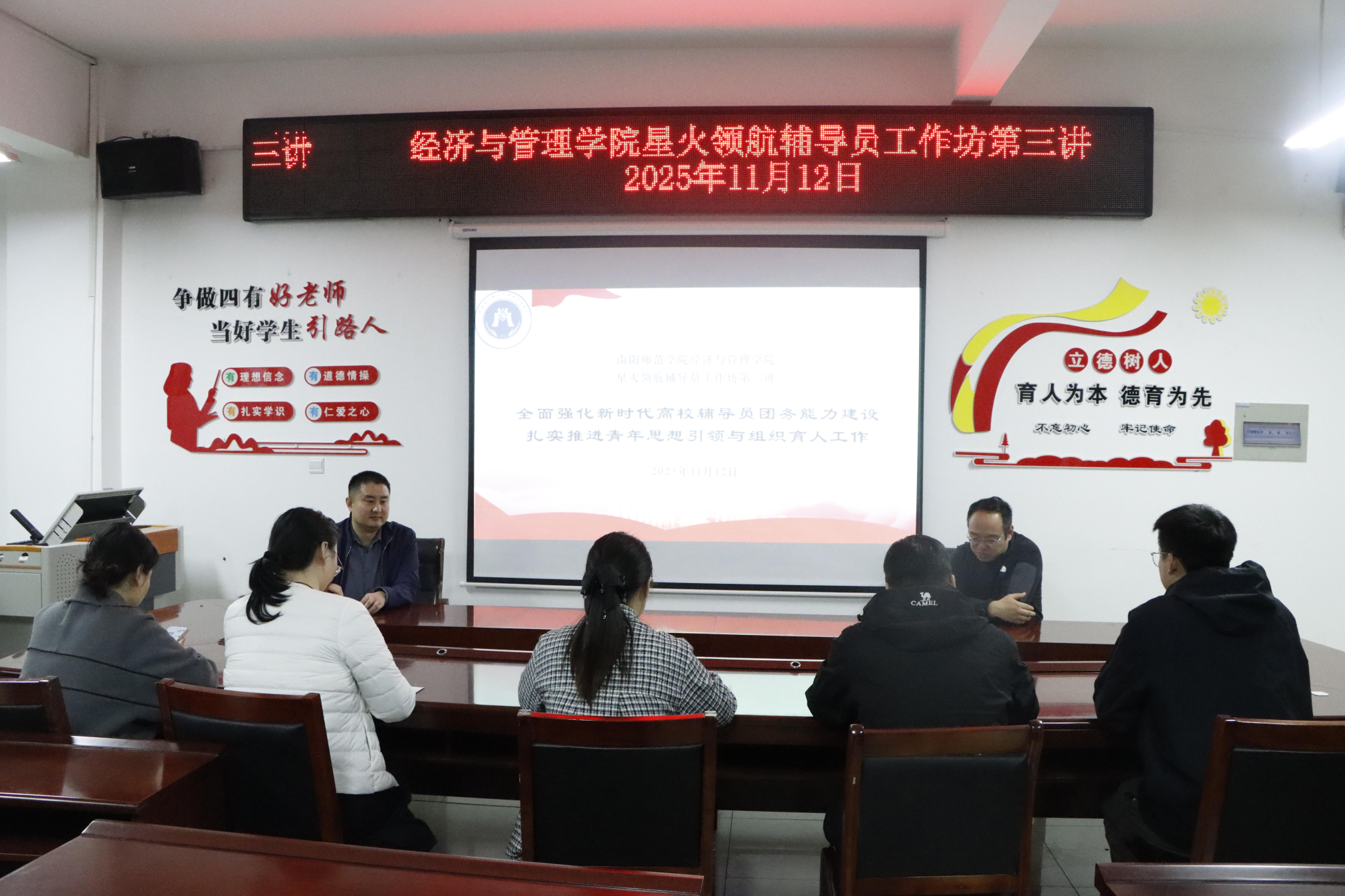 本网讯(通讯员 刘柯辛/文 陈梦璇/图)为全面强化辅导员队伍能力建设,扎实提升思想引领与组织育人工作质效,11月12日,经济与管理学院于本部科技楼201会议室开展星火领航辅导员工作坊第三讲。本次活动由我院党委副书记王传飞主持,校团委书记姬明飞主讲,我院团委副书记刘柯辛及全体辅导员参加。