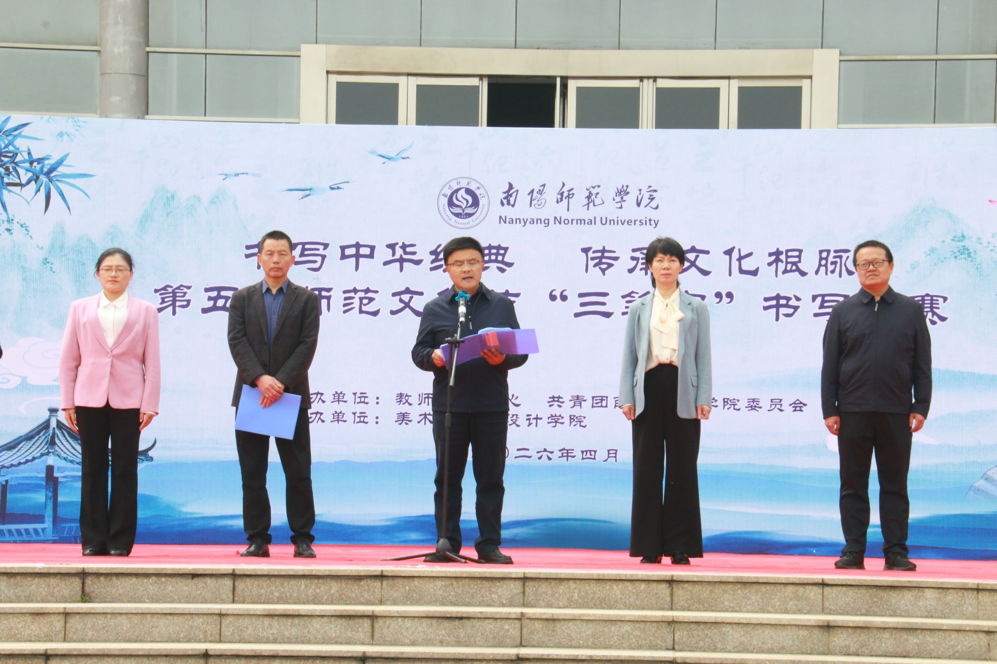 本网讯(杨眉 钟芳怡/文 何思 吴煦昀/图)为坚持立德树人根本任务,厚植师范文化底色,4月9日下午,由教师发展中心、校团委主办,美术与艺术设计学院承办的“书写中华经典,传承文化根脉”第五届师范文化节“三笔字”书写大赛决赛在逸夫楼东广场隆重举行。南阳师范学院党委副书记刘红林出席活动,教师发展中心、校团委、美术与艺术设计学院负责同志参加。