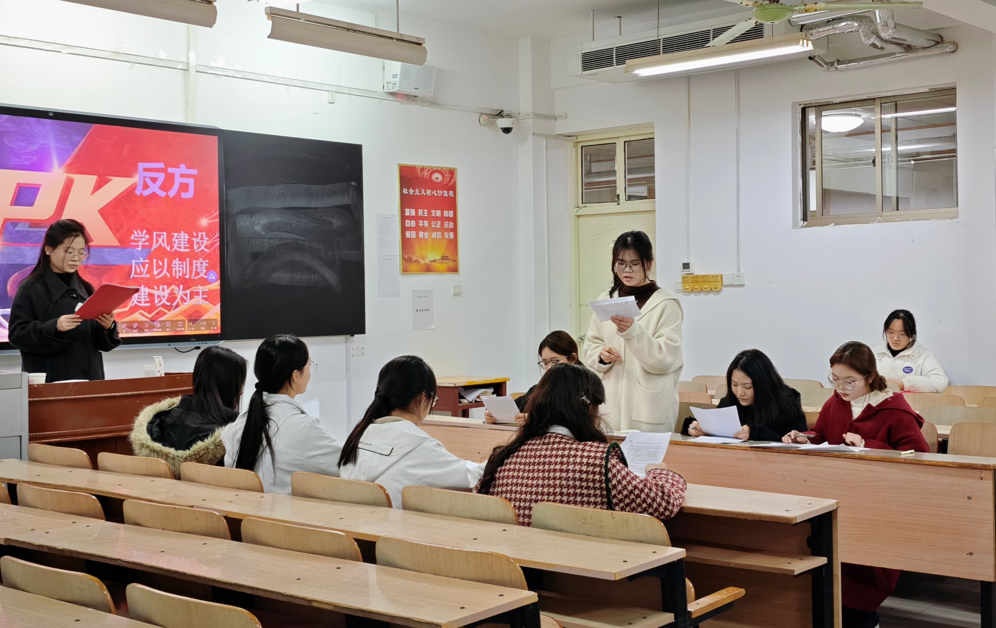 本网讯(通讯员 王梦娇 石宇佳/文 唐丽雯 张馨雅/图)为引导同学们深化对学风建设的理解,锻炼青年学生的表达能力、逻辑思维能力与团队协作能力,11月17日,学院辩论队与大学生调查研究社团在逸夫楼N407教室共同组织开展“学风建设应以思想引导为主还是制度建设为主”主题辩论赛,学院辩论队成员及2025级部分同学参加。