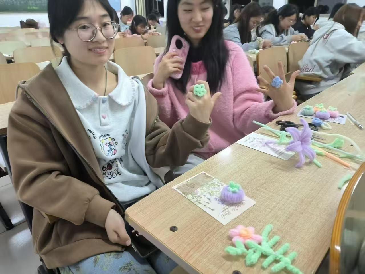 活动伊始,刘明媛详细介绍了活动主题与流程,生动演示了扭扭棒的折、扭、绕等制作技巧及明信片书写要领。在强调制作安全规范后,色彩斑斓的扭扭棒、彩纸及明信片被分发至成员手中。在创作环节,大家热情高涨,充分发挥奇思妙想。一根根平凡的扭扭棒在成员们的指尖翻飞,幻化成了绚丽的扭扭花、精致的戒指、俏皮的蝴蝶结等立体手作。与此同时,成员们在明信片上一笔一划写下对幼儿园小朋友的温暖寄语。活动现场欢声笑语,氛围温馨融洽。