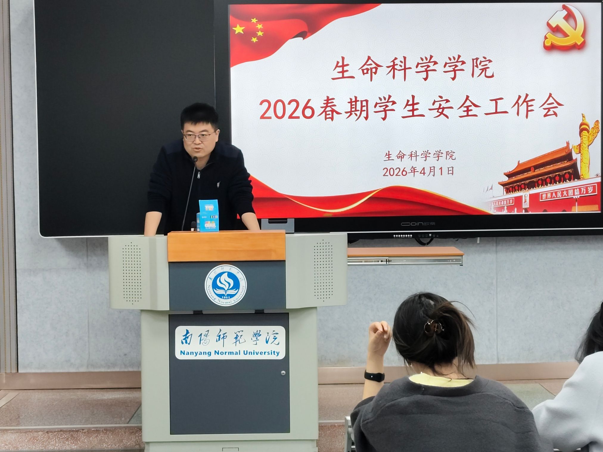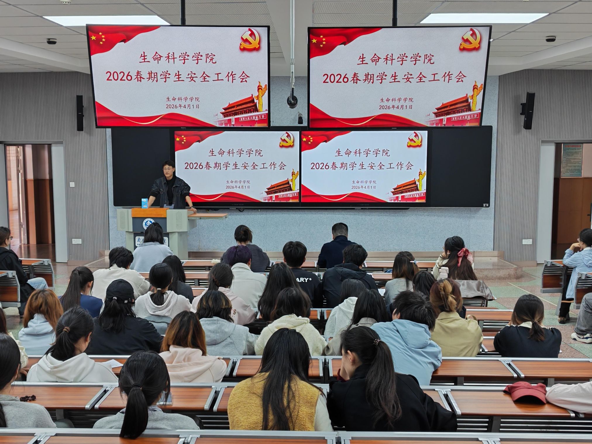 本网讯(通讯员 潘梓妍/文 王普/图)为增强同学们的安全意识,普及校园安全知识,确保同学们能够顺利开启新学期的学习与生活,4月1日下午,生命科学学院在综合楼101召开2026年春期学生安全工作会。本次会议由李兆锋老师主持召开,学院党委副书记韩鸿基与各年级辅导员常佳、刘亚楠等出席,生命科学学院学生干部参加。
