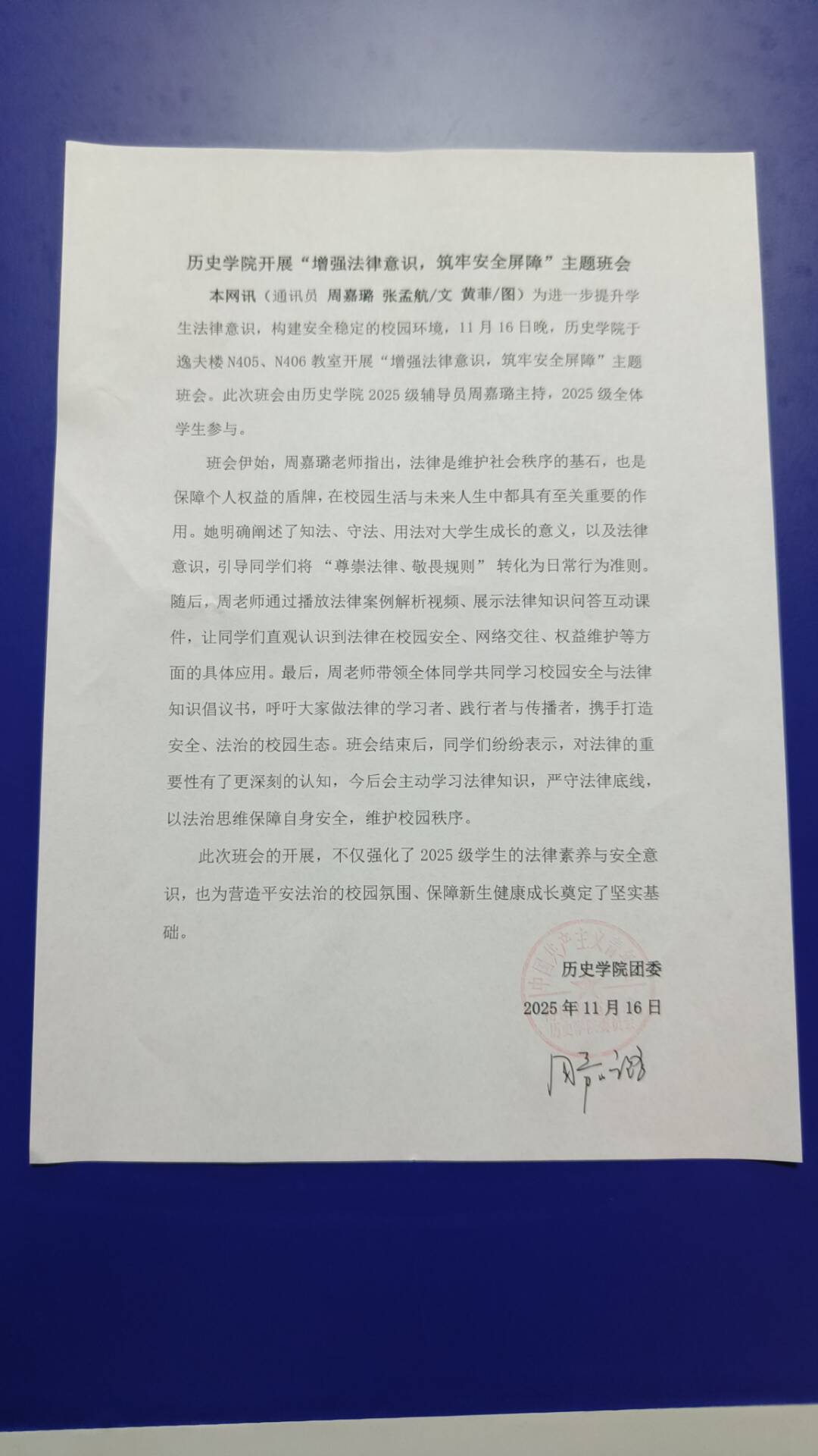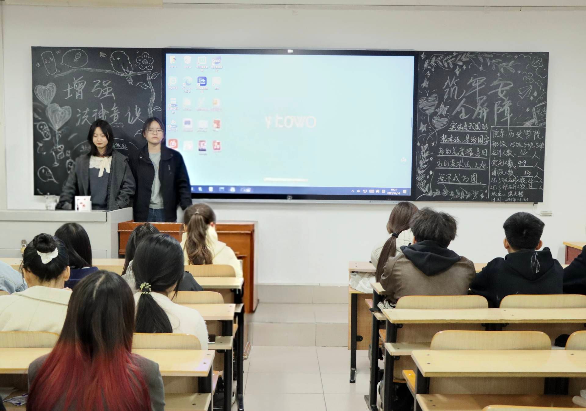 本网讯(通讯员 周嘉璐 张孟航/文 黄菲/图)为进一步提升学生法律意识,构建安全稳定的校园环境,11月16日晚,历史学院于逸夫教学楼N405、N406教室开展“增强法律意识,筑牢安全屏障”主题班会。此次班会由历史学院2025级辅导员周嘉璐主讲,2025级全体学生参与。