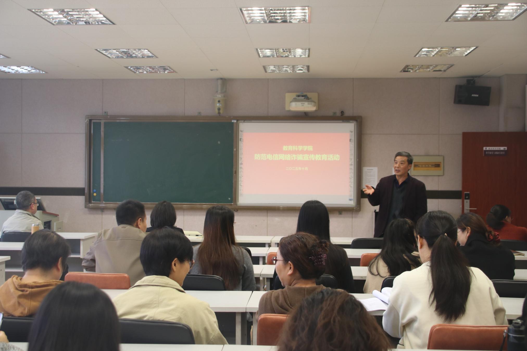 (本网讯 曹惠媛/文 郭飞 杨心雨/图)为筑牢校园安全防线,提升教职工反诈能力,10月15日下午,教育科学学院分会在科技楼418组织全体教职工,开展了防范电信网络诈骗集中宣传教育活动。