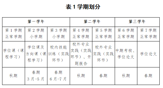 本专业硕士研究生培养三学年,培养环节以学期划分:分为7个学期,第1学期以学位课程学习为主,第2学期是为期12周的小学期,以选修方向课程学习为主,第3学期为期8周,重点进行校内技能训练,第4学期和第5学期整个1学年为进行校外专业实践环节,第4学期进行开题报告,第6学期进行中期考核,第6学期和7学期为完成学位论文阶段。学期划分见下表: