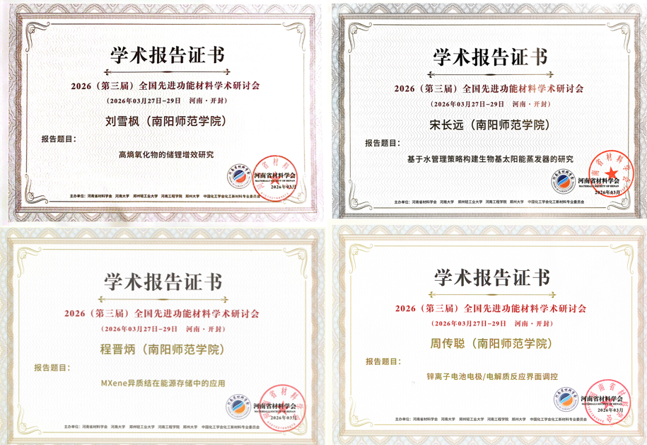 作为协办单位,我校刘雪枫、宋长远、程晋炳、周传聪四位教师应邀参会,并在分会场作专题报告。刘雪枫以《高熵氧化物的储锂增效研究》为题,系统分享其团队在储能材料改性与性能优化方面的前沿成果;宋长远围绕《基于水管理策略构建生物基太阳能蒸发器的研究》,深入阐述生物基材料在光热转化领域的应用探索与技术创新;程晋炳聚焦《MXene异质结在能源存储中的应用》,详细探讨相关材料的制备技术及性能提升路径;周传聪以《锌离子电池电极/电解质反应界面调控》为题,全面汇报锌离子电池界面工程调控策略的最新进展与应用前景。四位教师的报告紧扣学科前沿、内容详实扎实、针对性突出,赢得与会同行的高度认可,为后续跨校、跨领域的科研合作搭建了重要桥梁。此次参会不仅有效拓宽了我校科研人员的学术视野,进一步加强了与国内先进功能材料领域顶尖团队的交流合作,更显著提升了我校在该领域的学术影响力与行业认可度。
