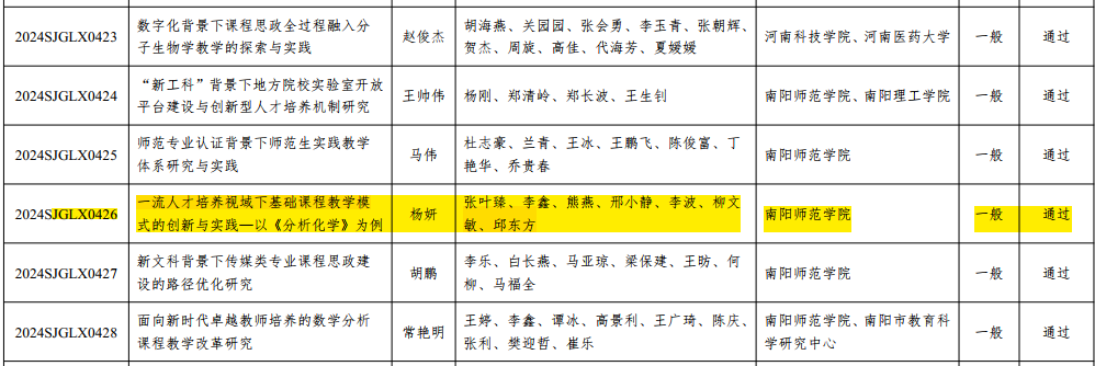 杨妍, 张叶臻, 李鑫, 熊燕, 邢小静, 李波, 柳文敏, 邱东方. 一流人才培养视域下基础课程教学模式的创新与实践—以《分析化学》为例. (河南省高等教育教学研究与实践项目(本科教育类): 2024SJGLX0426)