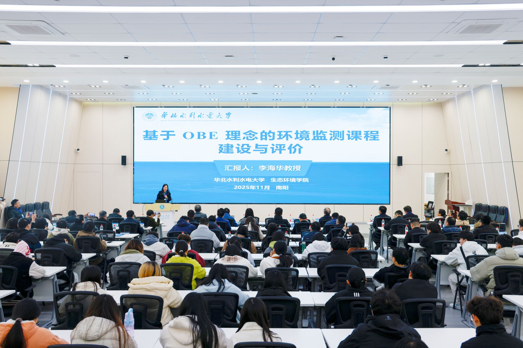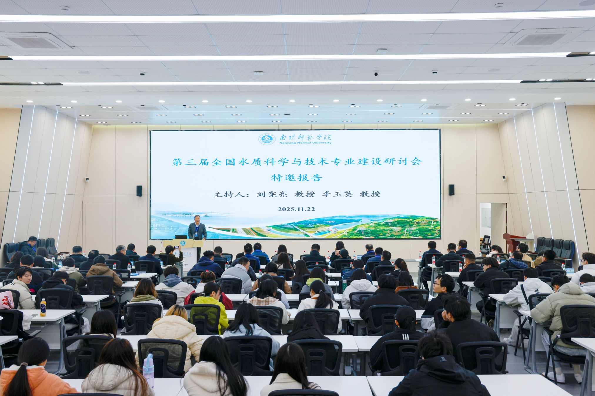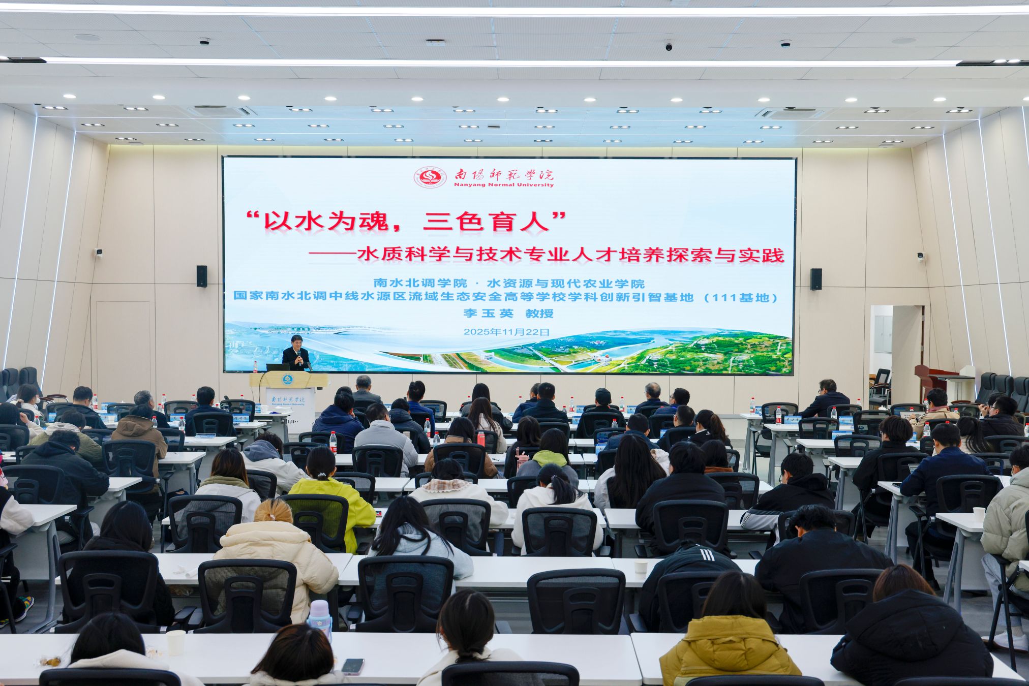 会议期间,多位专家学者围绕学科建设与人才培养作了专题报告。华北水利水电大学生态环境学院院长李海华教授以“基于OBE理念的环境监测课程建设与评价”为题,分享了课程体系构建与评价机制的创新思路;中国科学院三峡生态环境研究所所长、中国科学院大学(重庆)资源与环境学院院长吴胜军研究员在“三峡水库消落区生态过程研究及学科建设”报告中,探讨了生态过程研究与专业发展的融合路径;中国南水北调集团中线有限公司水质与环保中心主任、教授级高工常志兵系统阐述了“南水北调中线水质安全保障体系构建及对专业人才需求”,强调了工程实践对人才培养的推动;南水北调中线水源有限责任公司供水管理部彭晓然介绍了“丹江口水库高光谱遥感水质检测系统建设及应用”,展示了先进技术在水质监测中的实际成效;中国市政工程中南设计研究总院有限公司总工、教授级高工张辛平以“智慧水厂技术发展与应用”为题,剖析了智慧水厂的技术前沿与应用前景;南阳师范学院水资源与现代农业学院院长、国家南水北调中线水源区流域生态安全高等学校学科创新引智基地(111基地)负责人李玉英教授则围绕“‘以水为魂,三色育人’—水质科学与技术专业人才培养探索与实践”,分享了我校借助区位优势和国家重大调水工程特色育人模式的实践经验。专家们从不同角度一致强调了以学生为中心、夯实专业基础、提升实践能力在高等教育中的关键作用。