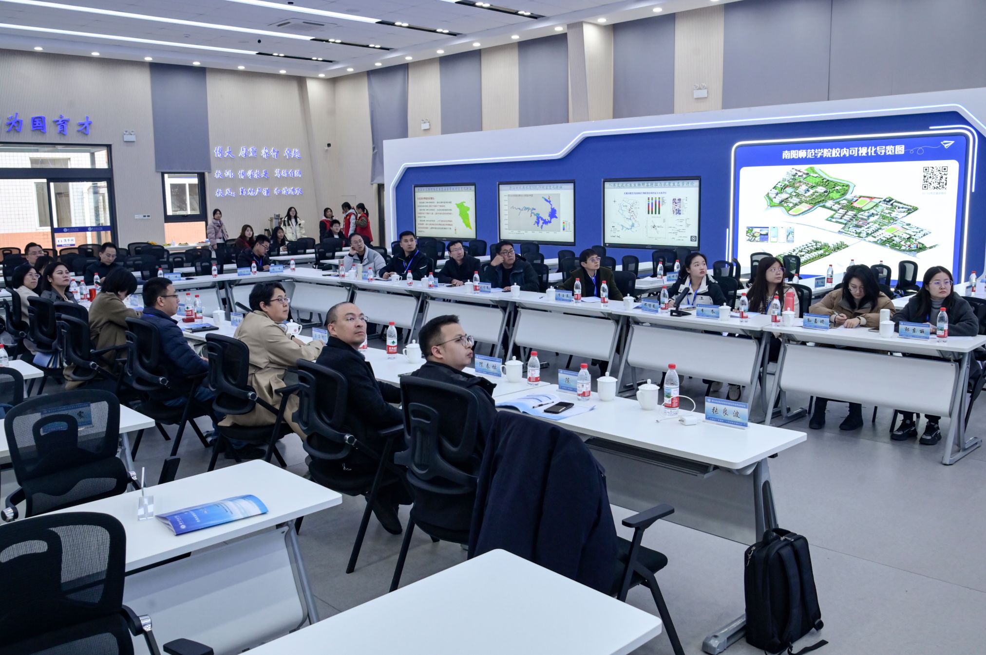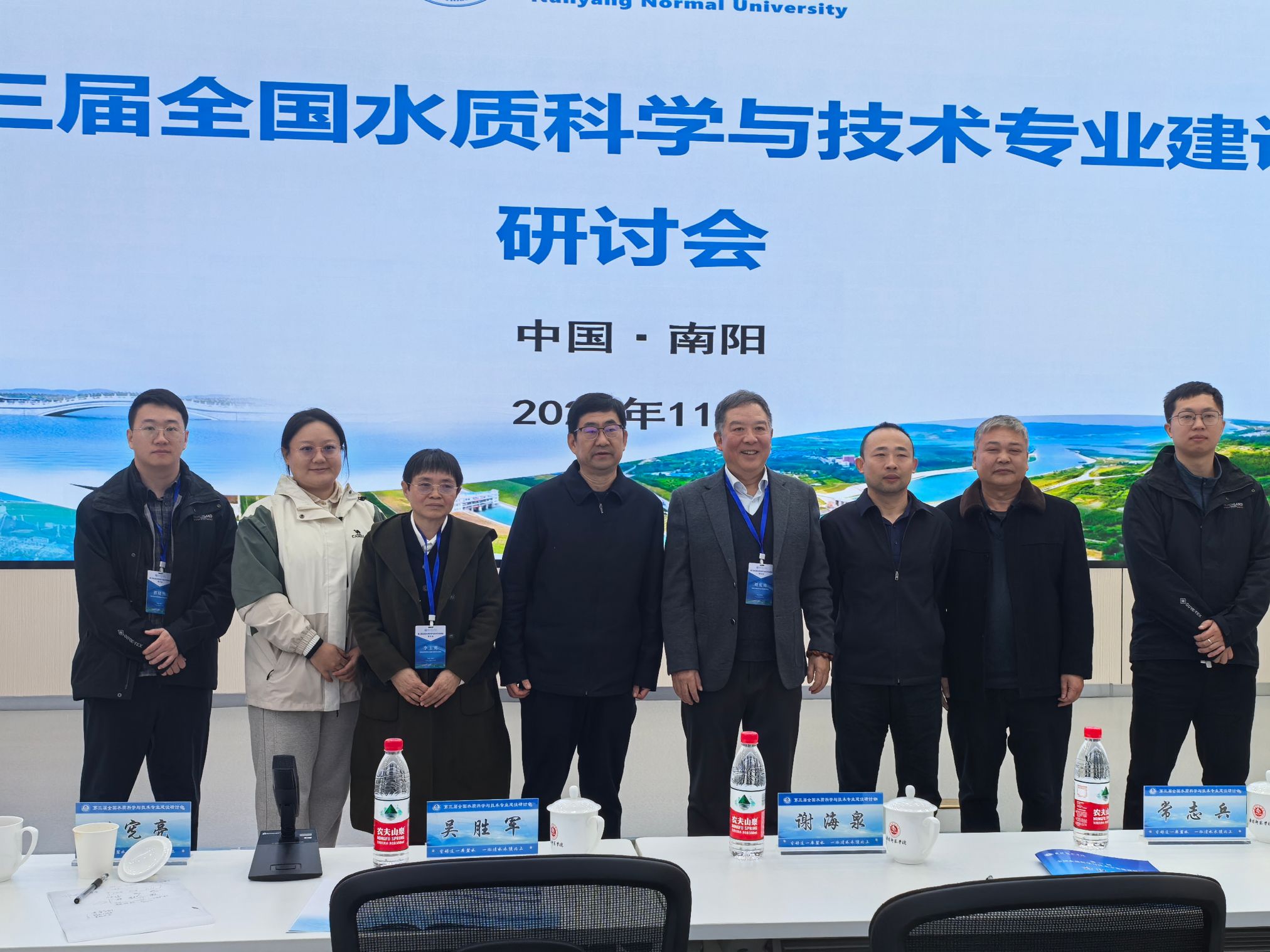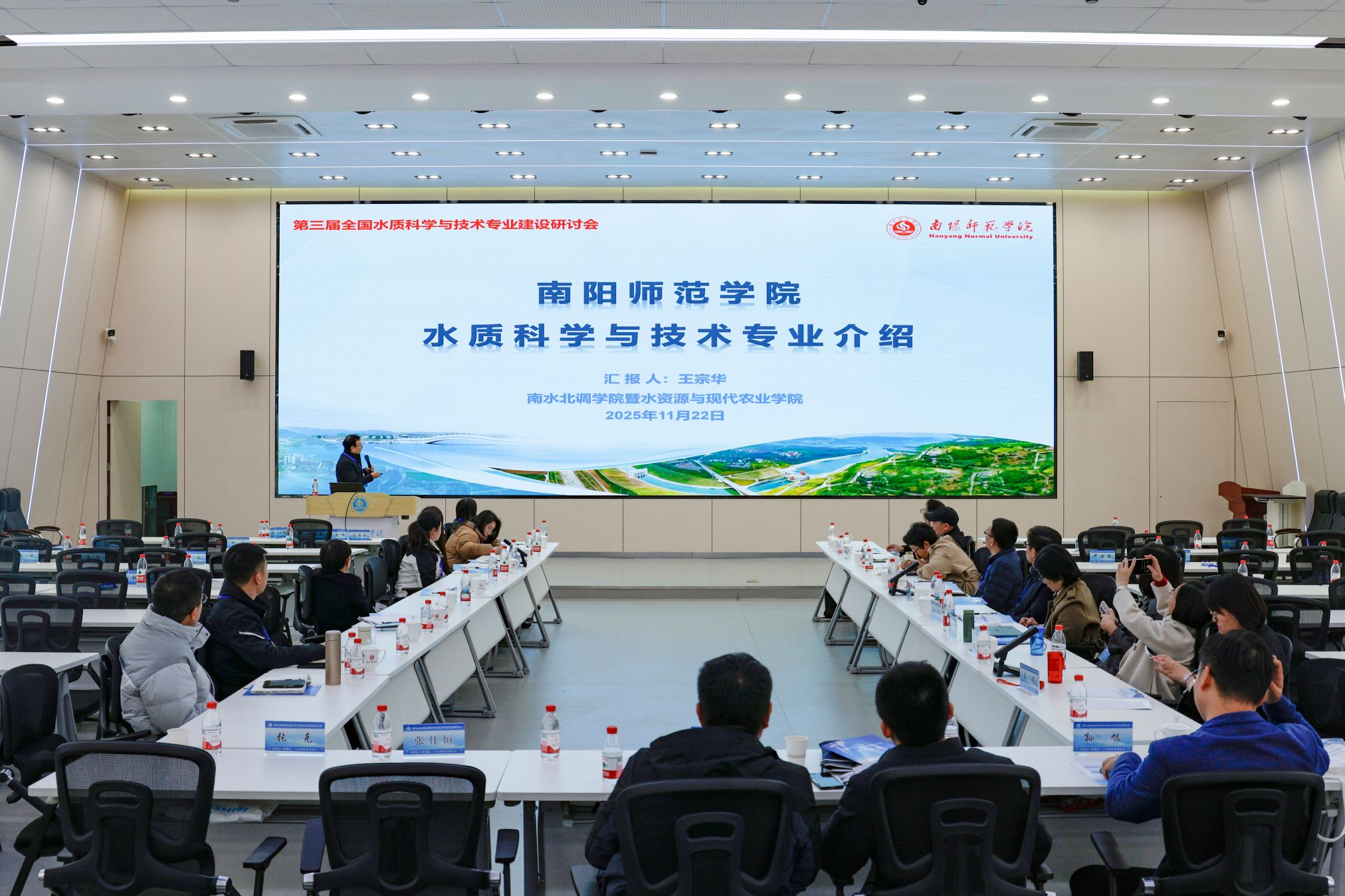 本网讯(彭建彪/文 孙宏运 林冬梅/图)11月22-23日,第三届全国水质科学与技术专业建设研讨会在我校成功召开。会议由南阳师范学院主办,南阳师范学院南水北调学院暨水资源与现代农业学院承办。南阳师范学院副校长谢海泉致辞,教务处副处长郭欣主持。来自南京工业大学、中国科学院三峡生态环境研究所、华北水利水电大学、呼和浩特民族学院、南京工程学院、河南工业大学、四川文理学院以及中国南水北调集团中线有限公司、南水北调中线水源有限责任公司、中国市政工程中南设计研究总院有限公司等相关高校和水务部门的领导、专业负责人和骨干教师70余人参加。我校南水北调学院暨水资源与现代农业学院、土木建筑工程学院、化学与制药工程学院等相关单位骨干教师参加会议。