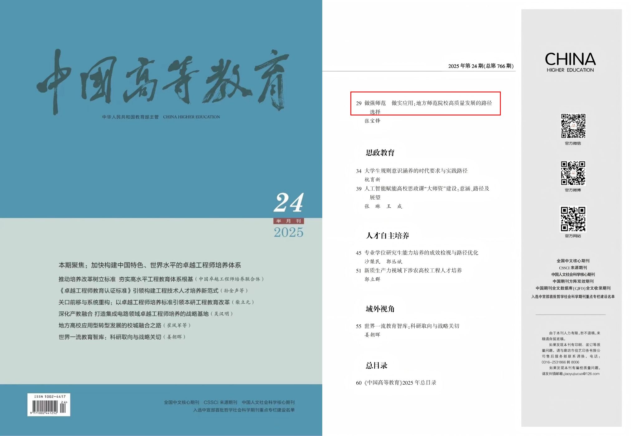 本网讯(通讯员 刘一夫)日前,中华人民共和国教育部主管、中国高等教育学会主办的权威学术期刊《中国高等教育》2025年第24期,刊发我校党委书记张宝锋教授署名文章《做强师范 做实应用:地方师范院校高质量发展的路径选择》。文章系统阐释了新时代地方师范院校改革发展面临的形势任务与机遇挑战,提出地方师范院校要坚持做强师范、做实应用,把握好师范办学与应用发展的权重均衡和互促关系,才能建成师范根基深厚、应用特色鲜明的高水平师范大学,更好助力经济社会高质量发展。