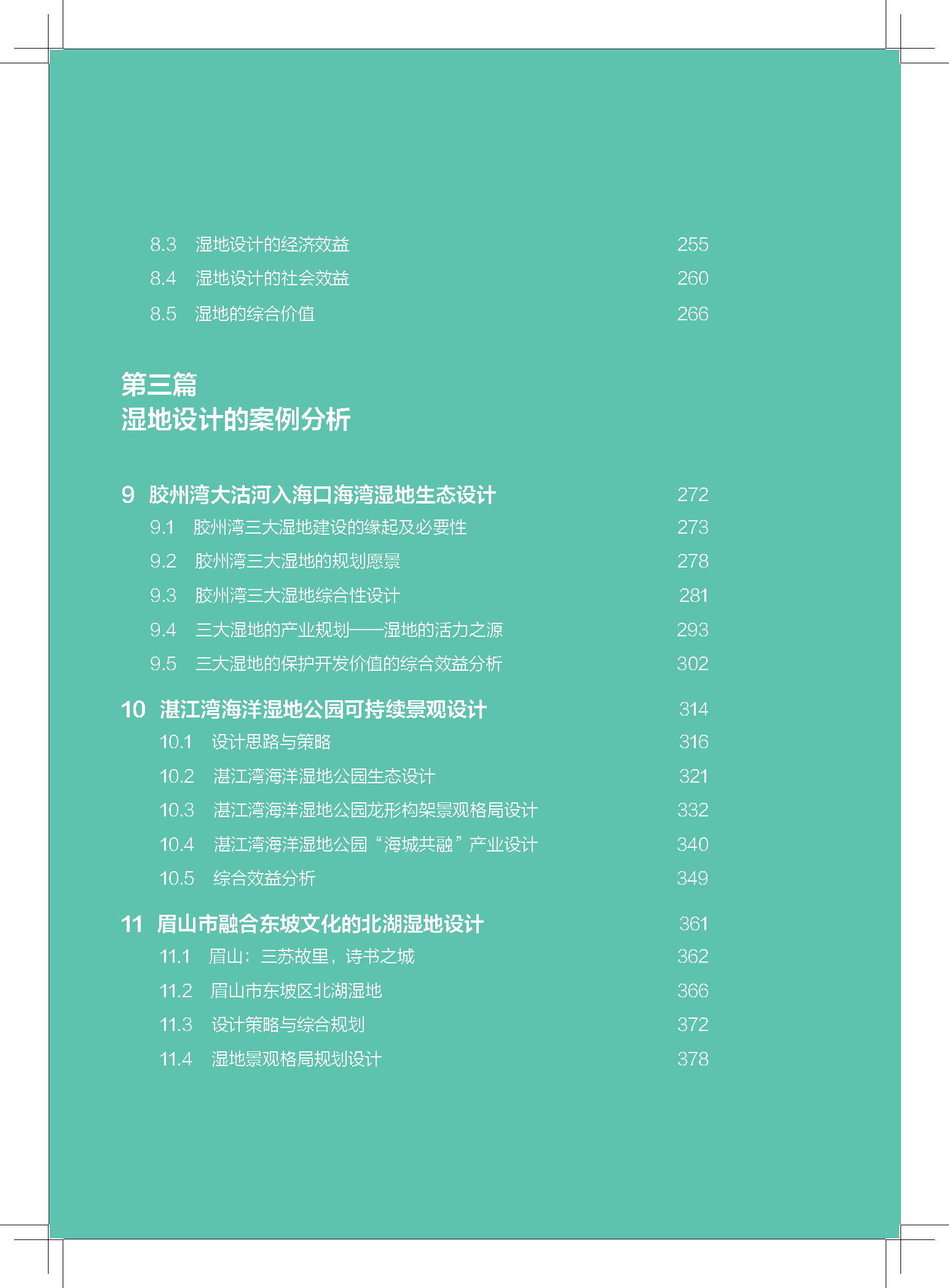 作为兼具理论深度与实践指导意义的力作,本书在内容上实现了多重突破与创新。其一,突破单一学科局限,融合湿地生态学、景观生态学、流域生态学、水域生态学、环境工程学等多领域知识,系统阐述各学科在湿地设计中的应用逻辑,搭建起跨学科的理论框架。其二,理论紧密结合实践,书中收录胶州湾大沽河入海口海湾湿地、湛江湾海洋湿地公园、眉山市北湖湿地等多个典型案例,通过具体项目解读设计理念与技术路线的落地路径。其中,眉山北湖湿地融合苏东坡文化,按其一生辗转轨迹设计 18 个湿地岛屿,实现生态、文化与经济效益共赢,成为湿地景观融合文化产业的标杆案例。