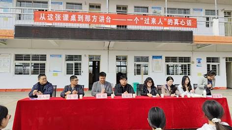 报告会上,刘韩以亲身经历为引,向学子们娓娓道来求学路上的坚守与付出。他结合自身研究方向向同学们讲解道:丹江口水库消落带的保护状况,直接关系到库区水质的安全,研究如何让家乡的水更干净,是家乡交给我的责任,也是国家对一名科研工作者的嘱托。这让台下同样生长在丹江岸边的孩子们深受触动——原来守护那一库碧水,不只是口号,更可以是一生奋斗的方向。三位研究生同学也结合亲身经历,从学习方法、心态调适、目标规划等角度分享了真心话,为乡村学子拨开迷雾、指引方向。报告会结束后,师生一行来到会议室,与面临升学关键节点的九年级学子进行面对面深入交流,就学业规划、水源地生态保护的未来研究方向等话题答疑解惑、加油鼓劲。