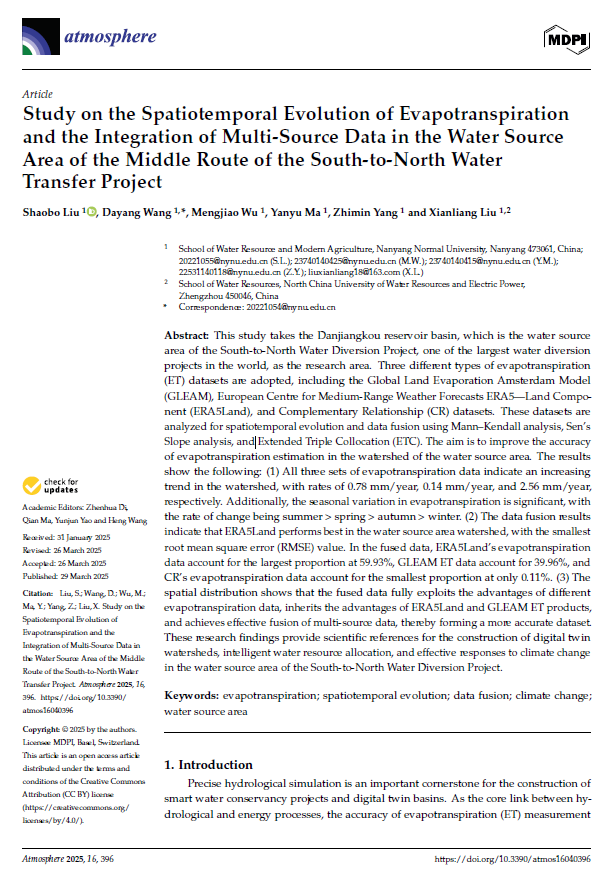 本网讯(通讯员 刘少博 王大洋)近日,我院南水北调中线水源区流域生态安全国家高等学校学科创新引智基地(111基地)南水北调流域生态安全团队联合华北水利水电大学,在《Atmosphere》期刊发表了题为“Study on the Spatiotemporal Evolution of Evapotranspiration and the Integration of Multi-Source Data in the Water Source Area of the Middle Route of the South-to-North Water Transfer Project”的研究论文,我院刘少博高级工程师为论文第一作者,王大洋博士为论文通讯作者,111基地引智专家刘宪亮教授(原南水北调中线干线工程建设管理局副局长)为合作作者,学院本科生吴梦娇、马艳羽、杨志敏等参与研究,南阳师范学院为第一署名单位。