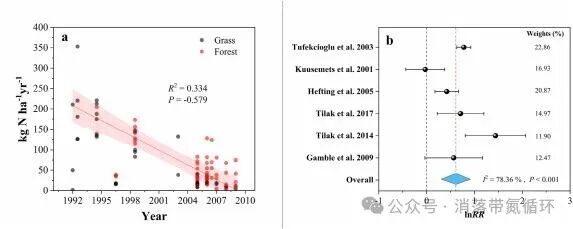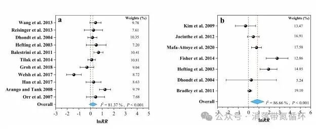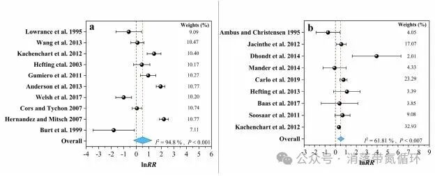 图5. 河岸带不同植被类型(森林与草地)对(a)反硝化速率和(b)N₂O排放速率影响的森林图。每个点代表一项研究的效应值,误差线为95%置信区间,蓝色菱形表示总体平均效应值及其95%置信区间