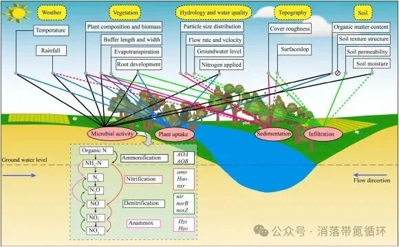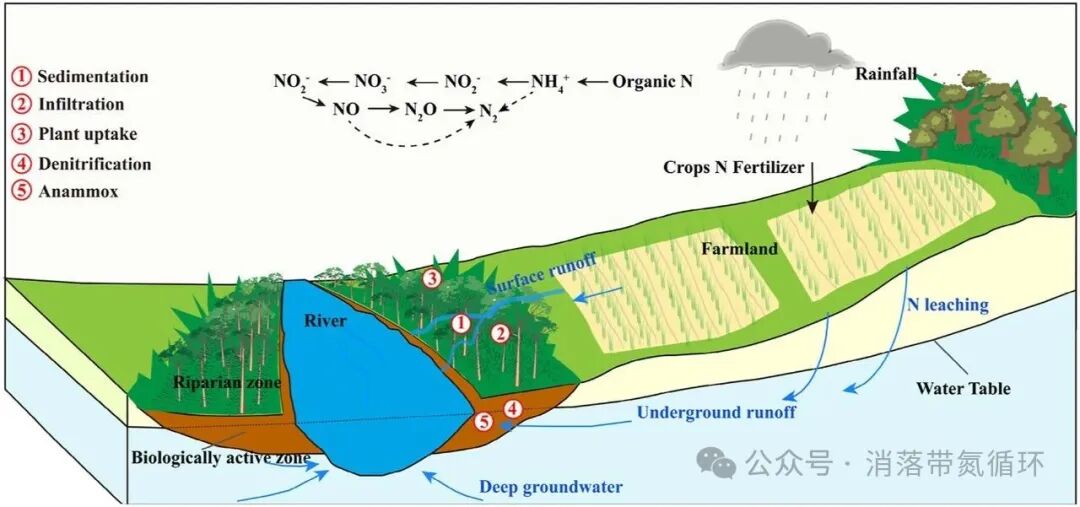 本文聚焦于农业区河岸带的氮素滞留与去除过程,研究背景主要源于农业非点源氮污染导致的水体富营养化和温室气体排放问题。长期以来,化肥过量施用使农田径流和渗漏成为氮输入水环境的重要途径,造成地下水硝酸盐积累、河流富营养化及N₂O排放增加。河岸带作为农田与水体之间的“最后防线”,在削减地表径流氮、促进地下水氮转化及植物吸收等方面发挥关键作用。然而,不同环境条件下河岸带的物理、化学与生物氮去除机制复杂,现有研究多集中于单一环节,缺乏系统整合与定量分析。