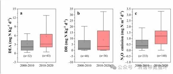 图3. 河岸带土壤中反硝化作用和N₂O排放在不同时间段(2010–2020年与2000–2010年)的变化效应。箱体上下边分别表示第25和第75百分位,箱内线和点分别代表中位数和平均值,括号中的数字为观测次数