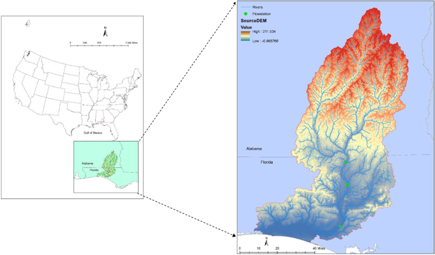 研究区域为美国阿拉巴马州与佛罗里达州交界的Choctawhatchee流域(面积约13,000 km²),该流域以农业和林业为主,是美国东南部典型的多源面污染区域。研究综合使用了SWAT模型 模拟结果、土地利用/土地覆盖(LULC)数据及自组织映射网络 (SOM)算法,结合逐步线性回归与ROC曲线分析,识别了影响氮(TN)与磷(TP)负荷的关键变量及其响应阈值。该研究强调了在流域管理中应同时考虑基于物理过程的模型与多变量统计分析 ,以便全面理解流域系统,如识别出关键源区其相关变量及临界阈值以维持良好的水质。
