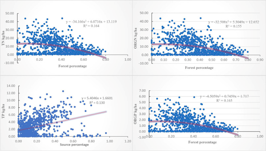 1. 森林与源区比例是决定水质空间分布的核心因素 :研究发现,森林覆盖率与氮素(TN、ORGN、ORGP)呈显著负相关,森林在削减氮负荷中发挥“汇作用;而源区(土地利用中的建设用地与耕地)与TP呈显著正相关,表明人类活动强度增加会显著提高TP浓度并恶化水质。森林与源区域的对比揭示了自然生态用地与开发用地在流域营养盐调控中的关键差异 。