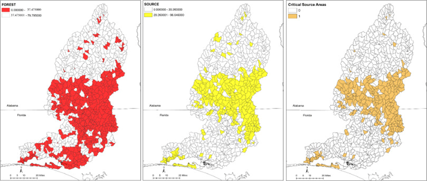 图6. 潜在关键源区的识别,包括森林百分比<37.47%(红色)、源百分比>20.26%(黄色)以及同时满足这两个标准的区域(橙色)。