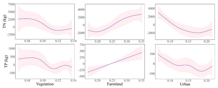 TN和TP与植被非线性负相关,与耕地呈现非线性正相关关系,与城市面积呈负相关 (图 4)。