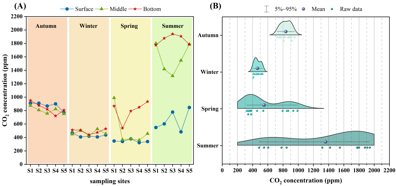 图 5. 丹江口水库分层水体在四季中 CO 2 浓度的时空分布特征。( A ) 秋、冬、春、夏四季中各采样点( S1–S5)在表层、中层和底层的 CO 2 浓度变化; ( B ) 各季节 CO 2 浓度的分布情况,蓝点为均值,误差线为 5%–95%置信区间,散点为原始数据。