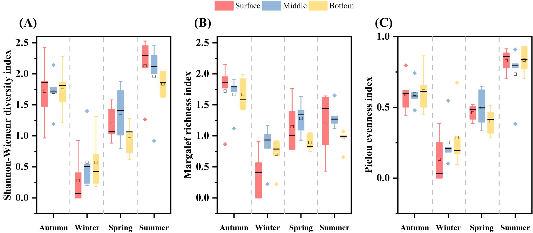 图 3. 浮游植物 α 多样性指数。( A ) Shannon-Wiener 多样性指数;( B ) Margalef 丰富度指数;( C ) Pielou 均匀度指数。