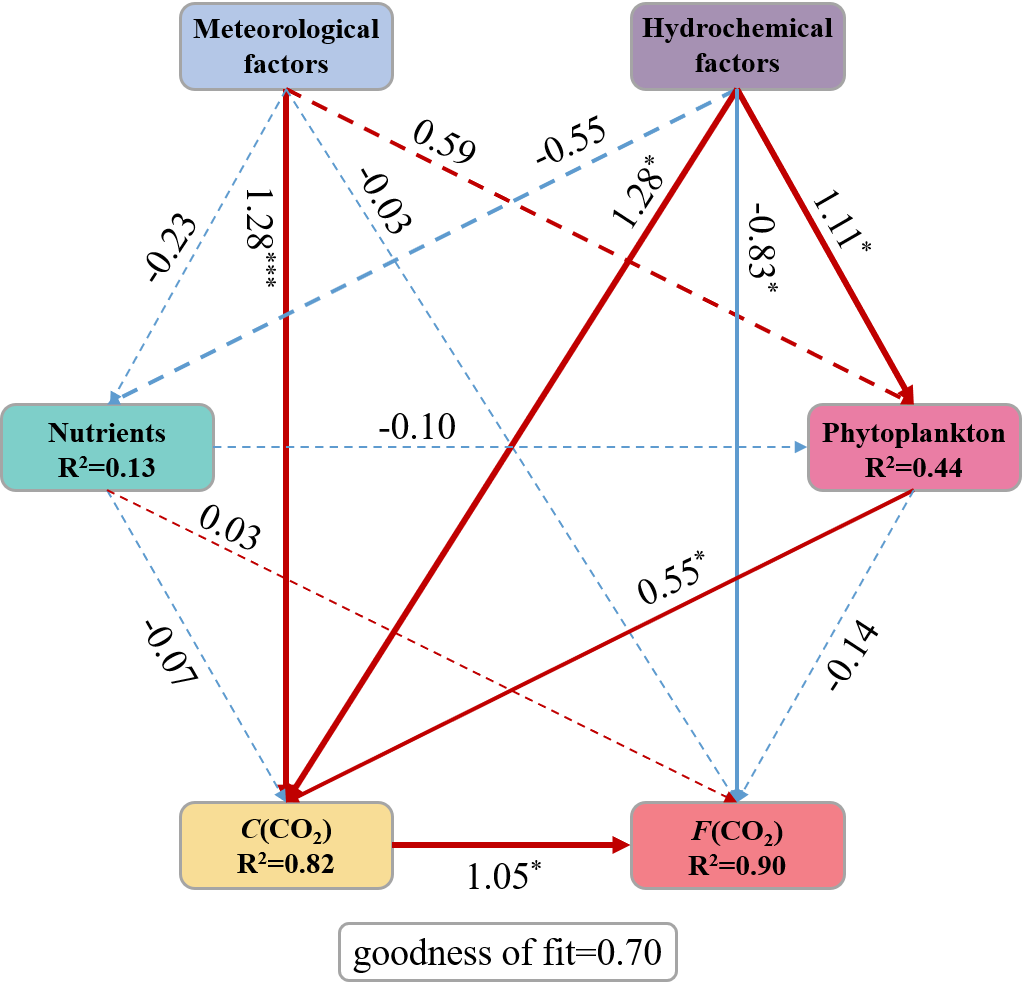 图 8 . 偏最小二乘路径模型( PLS-PM )揭示了气象因子、水化学因子、营养盐及浮游植物多样性指数对水体二氧化碳浓度与通量的直接与间接影响。箭头与连线的宽度表示路径系数大小,蓝色与红色连线分别代表正负效应。 R 2 表示目标变量的解释方差。(显著性标注: * p < 0.05, ** p < 0.01, *** p < 0.001)