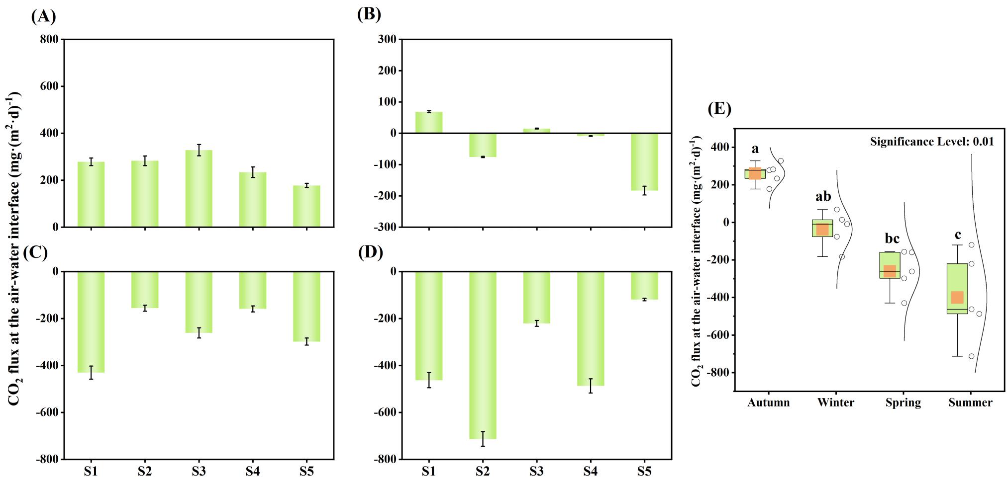 图 4. 丹江口水库不同季节和采样点水 -气界面 CO 2 通量分布特征。 ( A–D ) 分别为秋季 、 冬季 、 春季和夏季在不同采样点( S1–S5)的 CO 2 通量变化; ( E ) 显示各季节整体 CO₂通量的分布情况,箱线图中不同字母表示季节间存在显著性差异( p <0.01)。
