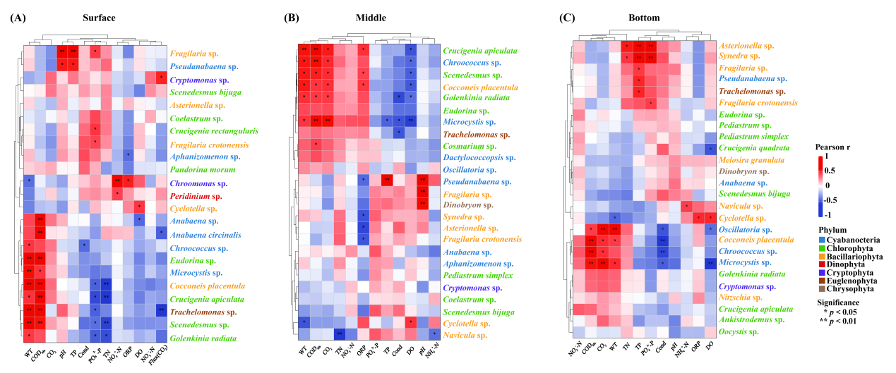 图 7. 浮游植物优势种丰度与环境参数之间的 Pearson 相关性热图。 展示了表层( A)、中层( B )、底层( C )不同藻类优势种与环境因子之间的相关性,颜色表示相关性强度,红色为正相关,蓝色为负相关,星号表示显著性水平( * p <0.05, ** p <0.01)。不同颜色字体代表不同藻类门类。