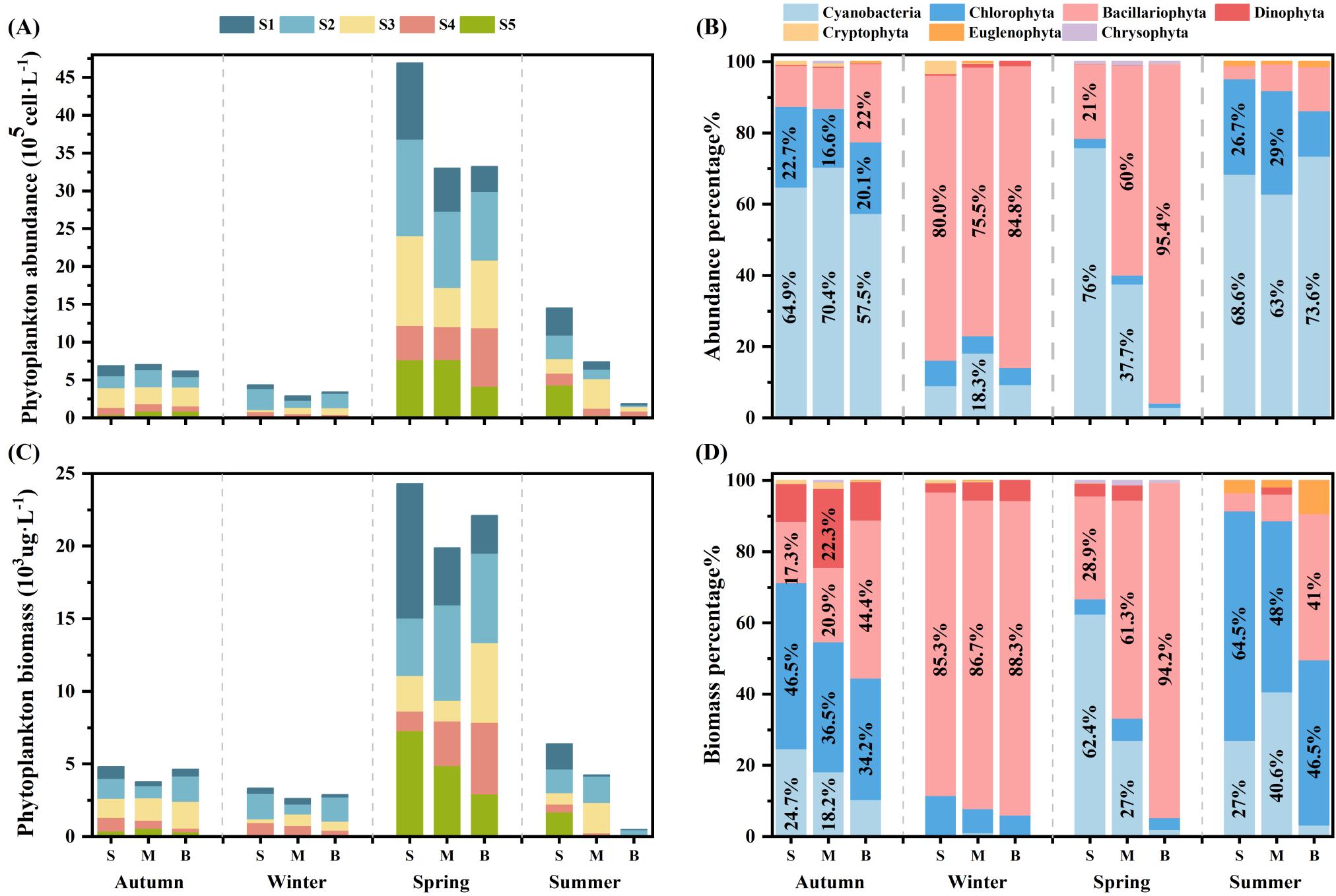 图 2. 丹江口水库不同 时空 浮游植物群落结构特征 。( A ) 浮游植物丰度 ( B ) 各类群丰度百分比 ( C ) 浮游植物生物量 ( D ) 各类群生物量百分比。 S、 M 、 B 分别代表表层、中层与底层 。