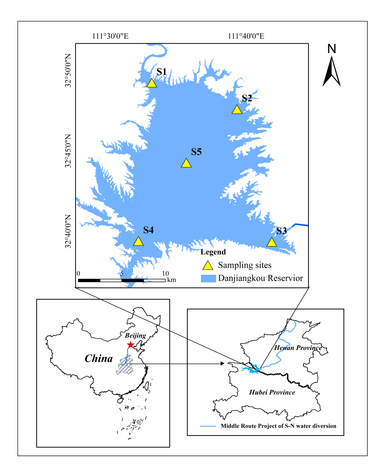 图 1. 丹江口水库五个采样点示意图。 S1-S5 为本研究设置的采样点位。
