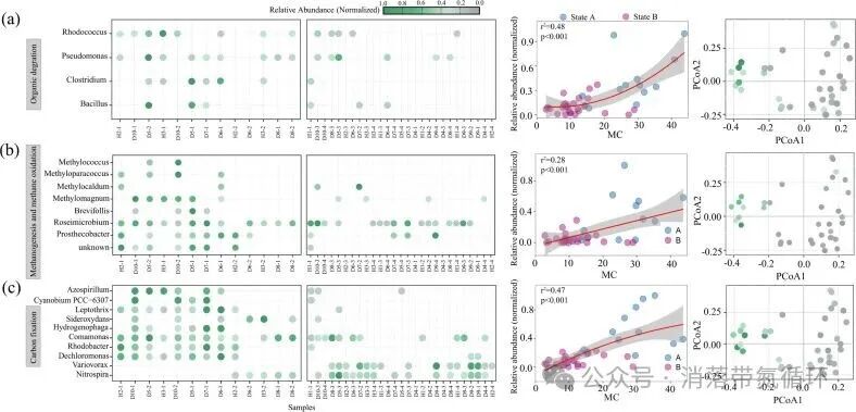图5. (a) 有机物降解:左图为属水平的标准化丰度在各采样点间的气泡图(绿色梯度表示丰度高低);中图显示含水量(MC)驱动的丰度变化趋势,采用二次多项式拟合(红线为拟合曲线,阴影为95%置信区间);右图为基于功能丰度着色的PCoA排序图。(b) 产甲烷作用与甲烷氧化过程的结果展示。(c) 碳固定过程。所有可视化结果均基于标准化的相对丰度数据绘制。