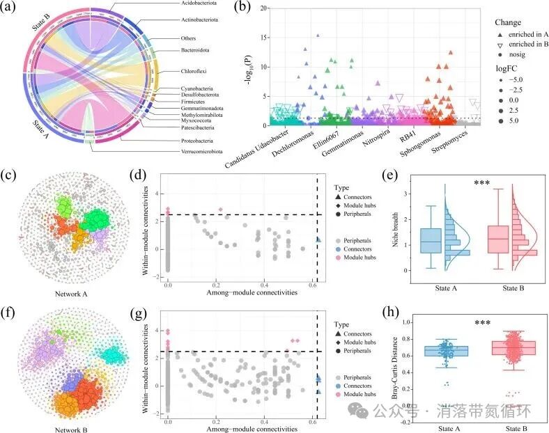图2. (a) 不同微生物群落状态下细菌群落在门水平的组成。(b) 曼哈顿图显示在属水平上,不同微生物状态下显著变化的细菌OTUs。红色虚线表示显著性阈值(p = 0.05)。(c) 和 (f) 双稳态微生物群落的网络特征。相同颜色的点表示属于同一模块,点的大小代表该OTU的连接度大小。(d) 和 (g) 分别为从网络A和网络B中筛选出的关键类群。(e) 微生物状态A与状态B之间生态位宽度的差异。(h) 不同微生物状态下群落间的Bray-Curtis距离比较。