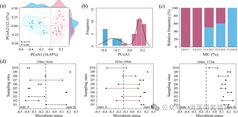 图1. (a) 基于OTU丰度矩阵(Bray-Curtis距离)的主坐标分析(PCoA)。R值和P值来自相似性分析(ANOSIM)。(b) 以PCoA1值表示的微生物群落状态的频率分布。(c) 微生物群落状态在不同含水量梯度下的相对分布频率。浅蓝色表示状态A,玫红色表示状态B。(d) 40个采样点的微生物群落状态的时间动态。每条水平线表示单个采样点相邻区段中PCoA1值的变化范围。蓝色虚线为区分微生物状态A和B的阈值;红色水平线表示跨越临界点(蓝色虚线)的微生物群落。