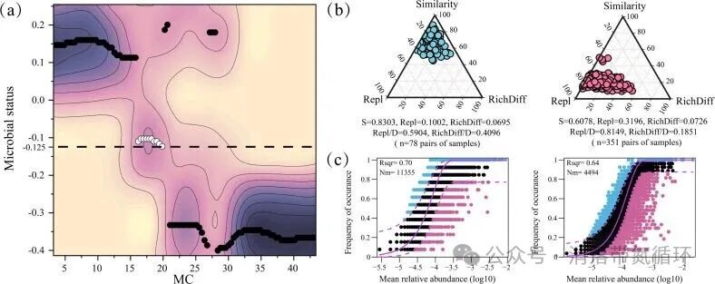 图3. (a) 微生物群落沿含水量梯度的响应轨迹。等高线(由浅至深的薰衣草色梯度)表示潜在能量梯度,颜色越深代表潜在能量越高。实心方块表示局部极小值(稳定状态),空心方块表示局部极大值(不稳定状态)。水平线标示出状态A与状态B的边界。(b) 三角图(单纯形图)展示不同微生物群落状态的生态过程(即物种替代与丰富度差异)。每个点(蓝色和粉色圆点)代表一对样品,其位置由相似性矩阵(S = 1 – D)、物种替代(Repl)和丰富度差异(RichDiff)的三个值共同决定,每组三个值之和为1。(c) 根据中性群落模型预测的OTU出现频率分布。