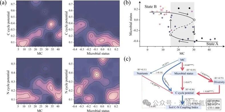 图6. (a) 含水量(MC)与微生物状态相对于碳/氮循环潜力的稳定性景观。四个面板(按顺时针方向):(1) MC–碳循环,(2) 微生物状态–碳循环,(3) 微生物状态–氮循环,(4) MC–氮循环。等高线(薰衣草色渐变)表示潜在能量梯度,由浅(低)到深紫色(高)逐渐增加。(b) 微生物状态与含水量(MC)的散点图,展示多稳态的恢复轨迹。点的颜色表示经log₁₀转换的碳循环潜力(薰衣草色渐变)。箭头指示不同稳定态之间的恢复路径,灰色阴影区域表示转变区。(c) 结构方程模型(SEM),用于探讨含水量(MC)、营养物(有机碳,OC)、微生物状态、多样性(香农–维纳指数)、碳循环潜力及土壤碳–氮耦合指数对生态系统过程的直接与间接影响。玫红色线表示显著负相关,蓝色线表示显著正相关,虚线表示不显著关系(p ≥ 0.05)。显著性水平:* 表示 p < 0.05;** 表示 p < 0.01;*** 表示 p < 0.001。