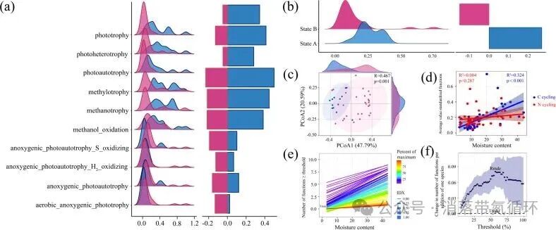 图4. (a) 左图:基于FAPROTAX分析的不同微生物状态下碳代谢主要功能的岭状图;右图:左图中标准化功能的平均值。(b) 不同微生物状态下标准化功能平均值的岭状图与双变量直方图。(c) 基于每个采样点平均标准化碳代谢功能值的主坐标分析(PCoA)。R值和P值来源于相似性分析(ANOSIM)。(d) 含水量对碳循环和氮循环指标的影响。实线表示回归拟合曲线,阴影区域表示拟合的95%置信区间。(e) 含水量与预测碳代谢功能数量之间的关系,该数量定义为在全区间(0–100%)内达到或超过最大预测碳代谢功能一定比例阈值的功能数。Tmin为最低阈值线,其斜率显著不为0。(f) 不同阈值条件下,含水量与达到或超过相应比例阈值的预测碳代谢功能数量之间关系的斜率变化。点表示拟合值,阴影表示±1置信区间。Tmde为斜率最陡的阈值,Rmde为在Tmde处估算的最大斜率。