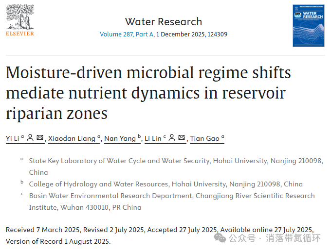 丹江口水库消落带的微生物群落在湿度梯度下呈现显著的双稳态特征。随着土壤含水量增加,群落结构未呈线性变化,而是在中等湿度附近出现突变,形成“干态群落”和“湿态群落”两种稳定状态。潜在景观分析与Gaussian混合模型均验证了这一多稳态特征,并揭示群落转变具有明显的滞后效应,即湿度升高与降低时的临界阈值不同。两种稳定态下,微生物多样性、功能组成及共现网络结构差异显著。湿态群落具有更高的碳降解与反硝化潜力,而干态群落在氨氧化及有机物矿化功能上占优。环境因子分析表明,含水量、总有机碳及铵态氮是驱动群落状态转变的关键因子。结构方程模型结果进一步表明,湿度通过影响群落结构间接调控碳氮循环过程。总体上,研究揭示了水位波动驱动的湿度变化可引发微生物群落的状态跃迁与功能重组,从而导致消落带生物地球化学过程的非线性响应。