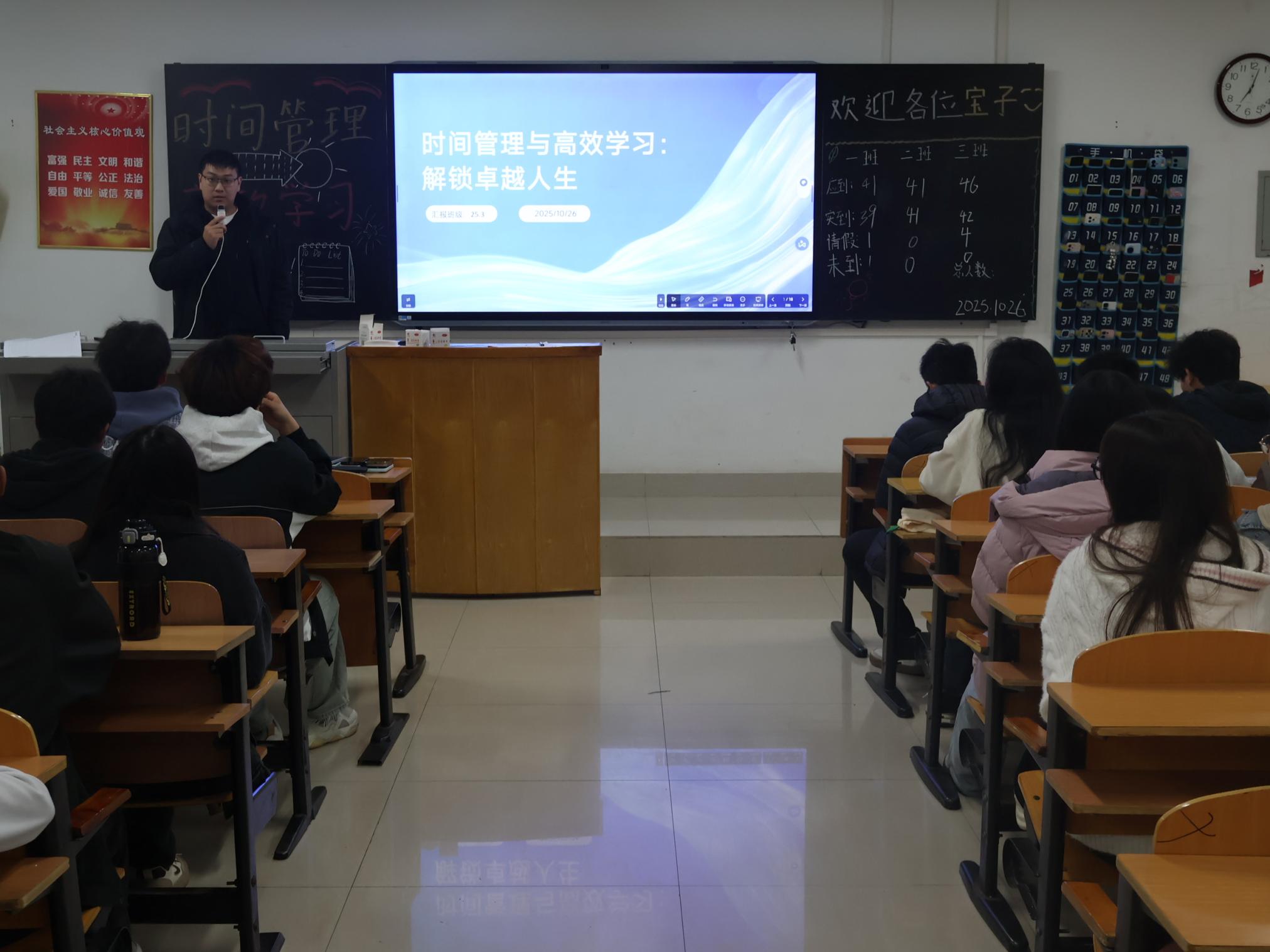 本网讯(通讯员 薛智阔 殷慧茹/文 欧阳榜荣/图)为帮助学生认识时间管理的重要性,掌握实用方法,巩固时间管理能力,10月26日,人工智能与软件工程学院于西区张衡楼,淅川校区实训楼和科技楼组织开展了“时间管理要擅长,高效学习本领强”主题班会。2025级辅导员田羽博、李巧、陈美羲、李青原、王玺涵、孙炎、崔纪宏、郭丹宁主持,2025级全体同学参加。