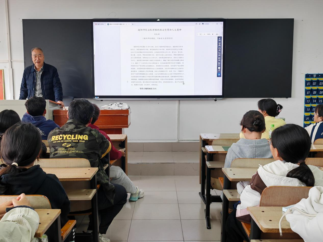 本网讯(通讯员 唐李静 杨梓钰/文 李梦珂/图)为传承校史文化,增强学生的归属感与荣誉感,帮助新生树立理想信念、明确奋斗目标,10月14日下午,我院于逸夫楼S506教室开展“建校70周年的智慧与精神”教育讲座。本次讲座特邀我校教授、河南省文史馆馆员刘太祥担任主讲,2025级部分新生参加。