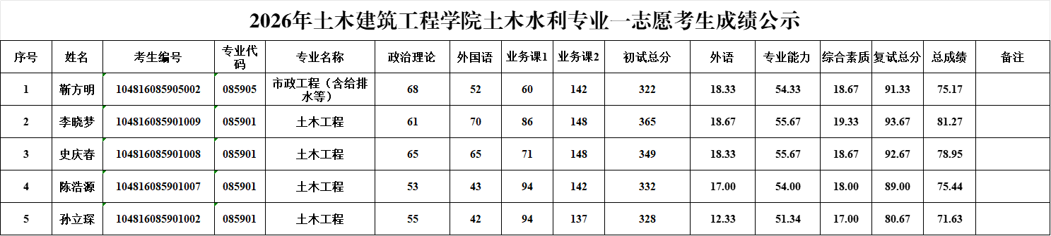 2026年土木建筑工程学院土木水利专业一志愿考生成绩公示