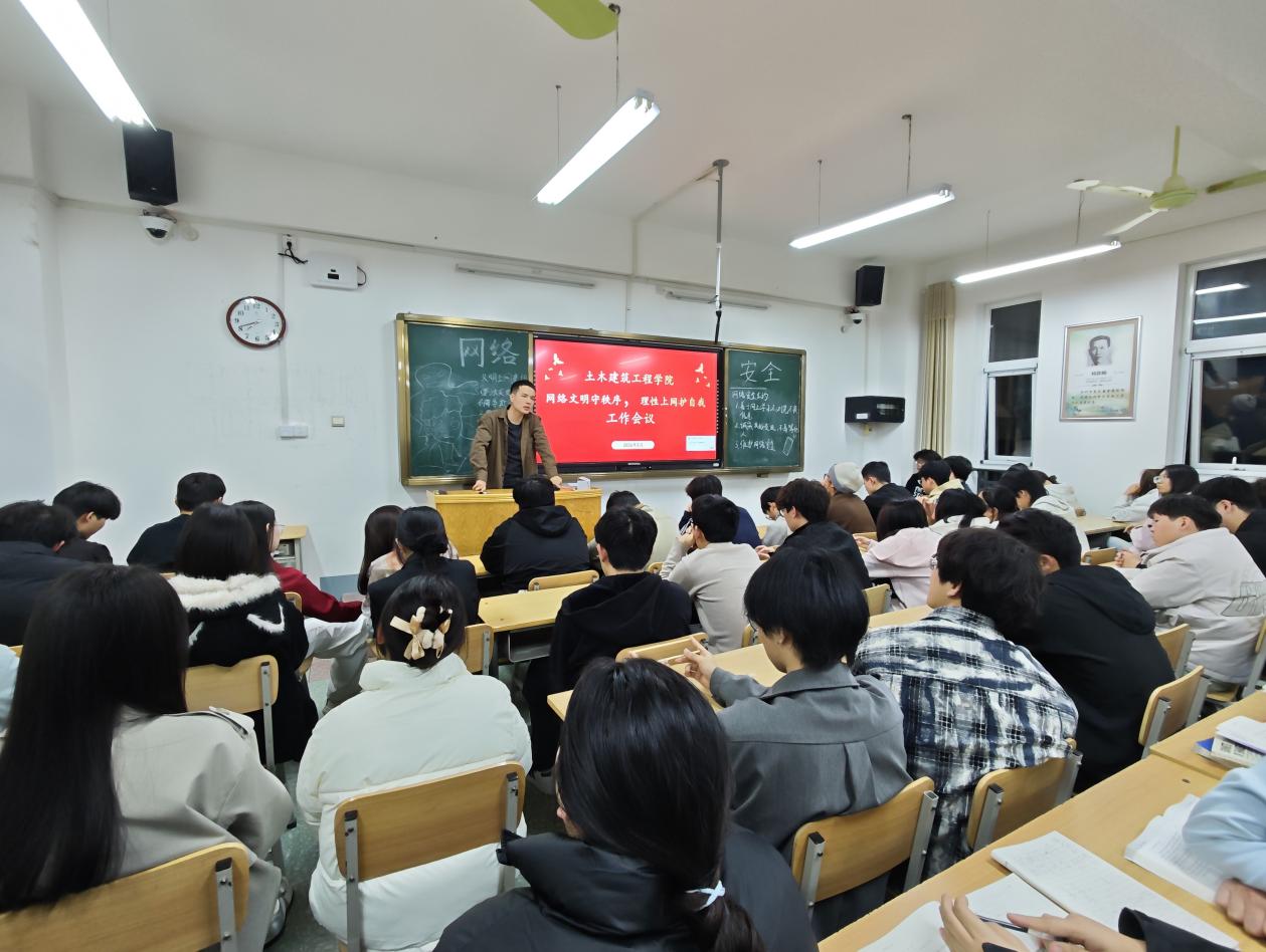 本网讯(通讯员 李佳素/图王天昊/文)为引导学生树立正确的网络观念,规范网络行为,增强网络安全防范意识与自我保护能力,营造健康、文明、有序的网络环境。土木建筑工程学院于3月22日晚在实训楼2507教室组织开展了“网络文明守秩序,理性上网护自我”主题班会,本次班会由辅导员张永旺主持,2025年级全体同学共同参与。