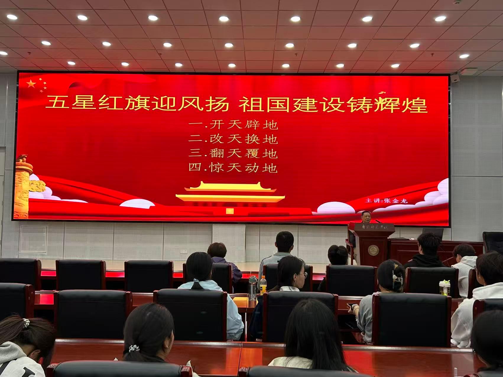 本网讯(通讯员 王珂/图 张睿思/文)为弘扬爱国主义精神,增强学生的国家认同感与时代责任感,2025年10月15日晚,土木建筑工程学院在留学生公寓学术报告厅开展“五星红旗迎风扬,祖国建设铸辉煌”主题讲座。讲座由张金龙书记主讲,25级全体学生参加会议。
