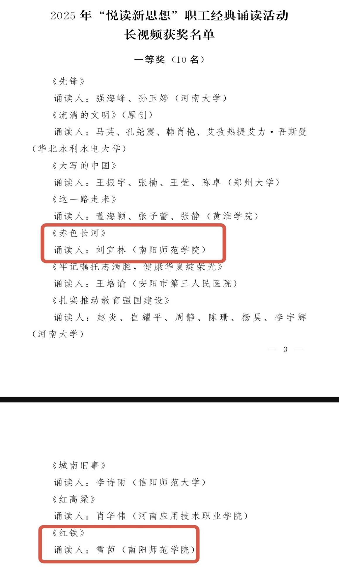 在本届比赛中,我院刘宜林老师的诵读作品《赤色长河》和雪茵老师的诵读作品《红铁》在全省各单位上报的193个经典诵读长视频作品中均荣获一等奖。本次赛事全省仅评选出10名一等奖获得者,这份荣誉的取得不仅是我院教师良好文化素养的体现,更是我院职工文化建设成果的生动体现。新闻与传播学院将结合自身专业特点和优势,不断创新方式方法, 持续搭建多元文化平台,进一步巩固和深化 “悦读新思想”经典诵读活动成效,激励广大职工以更加饱满的热情和昂扬的斗志,为奋力谱写中原大地推进中国式现代化新篇章贡献智慧和力量。