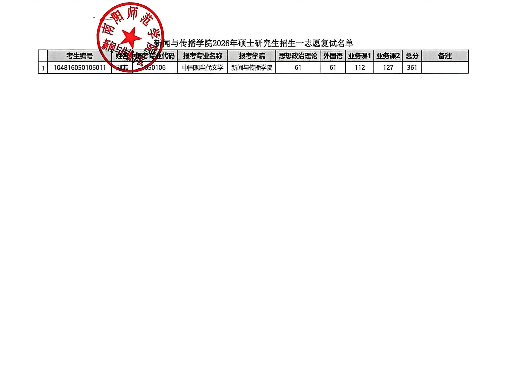 南阳师范学院新闻与传播学院2026年硕士研究生招生一志愿复试名单